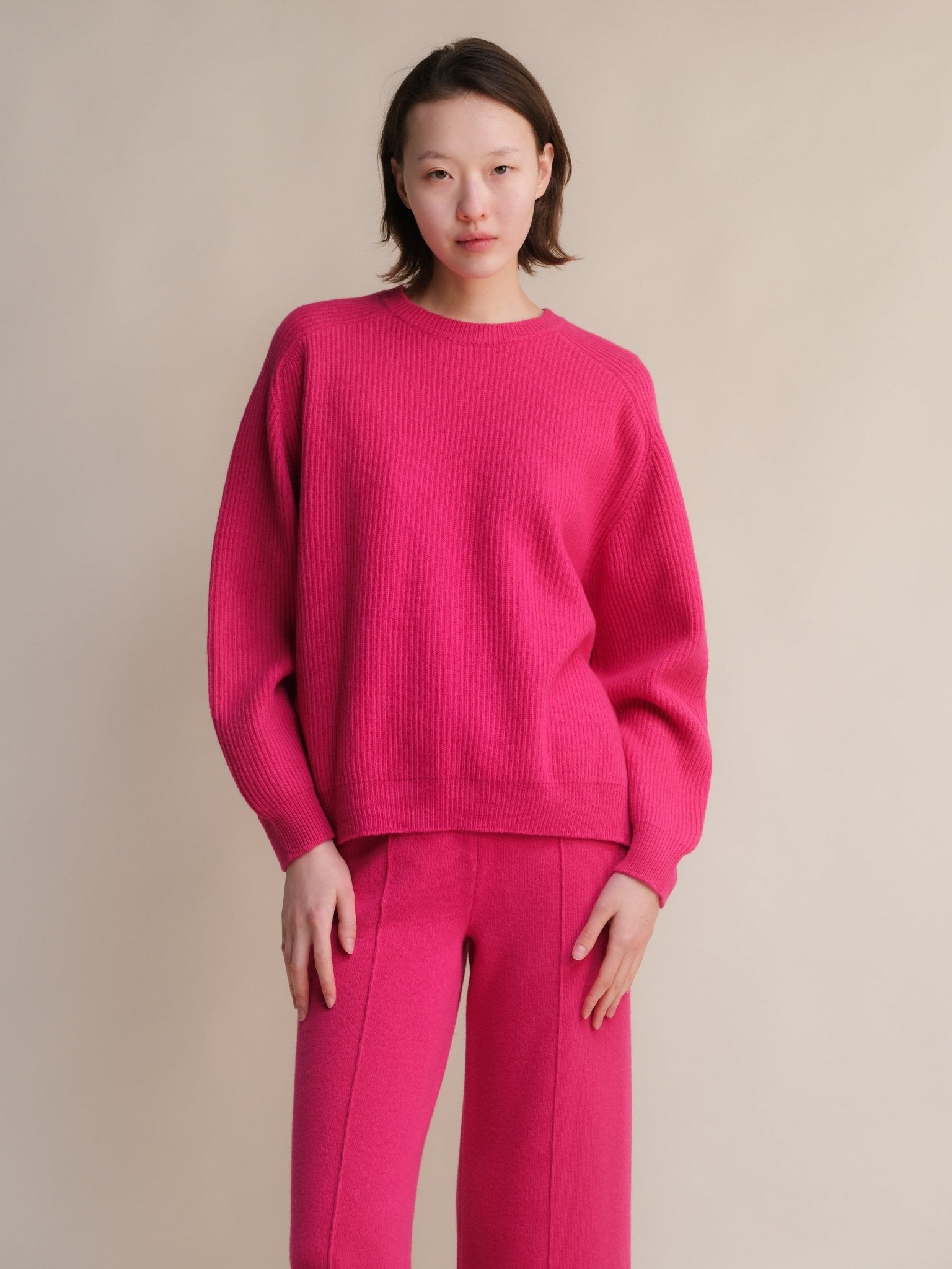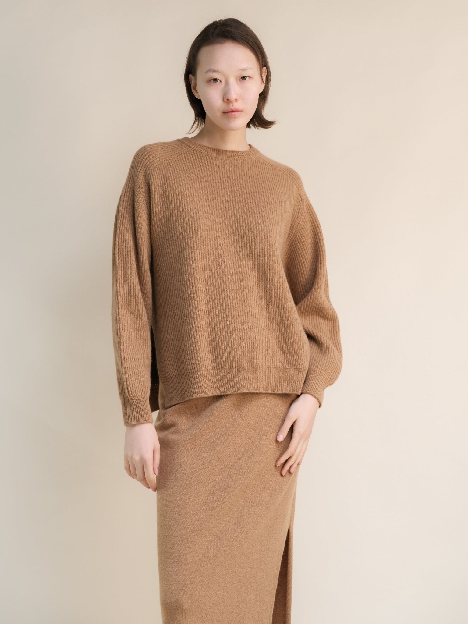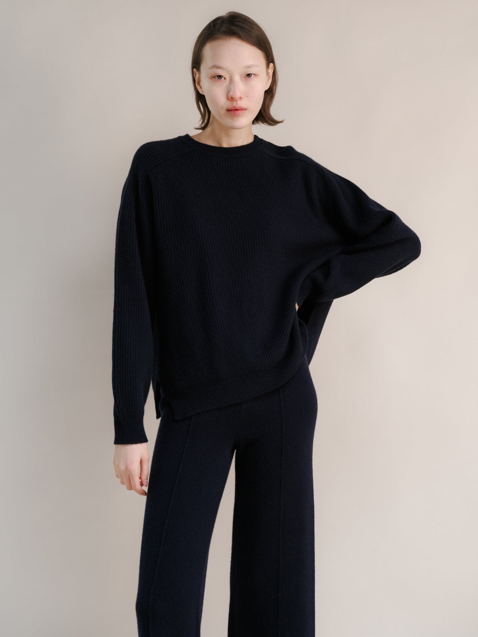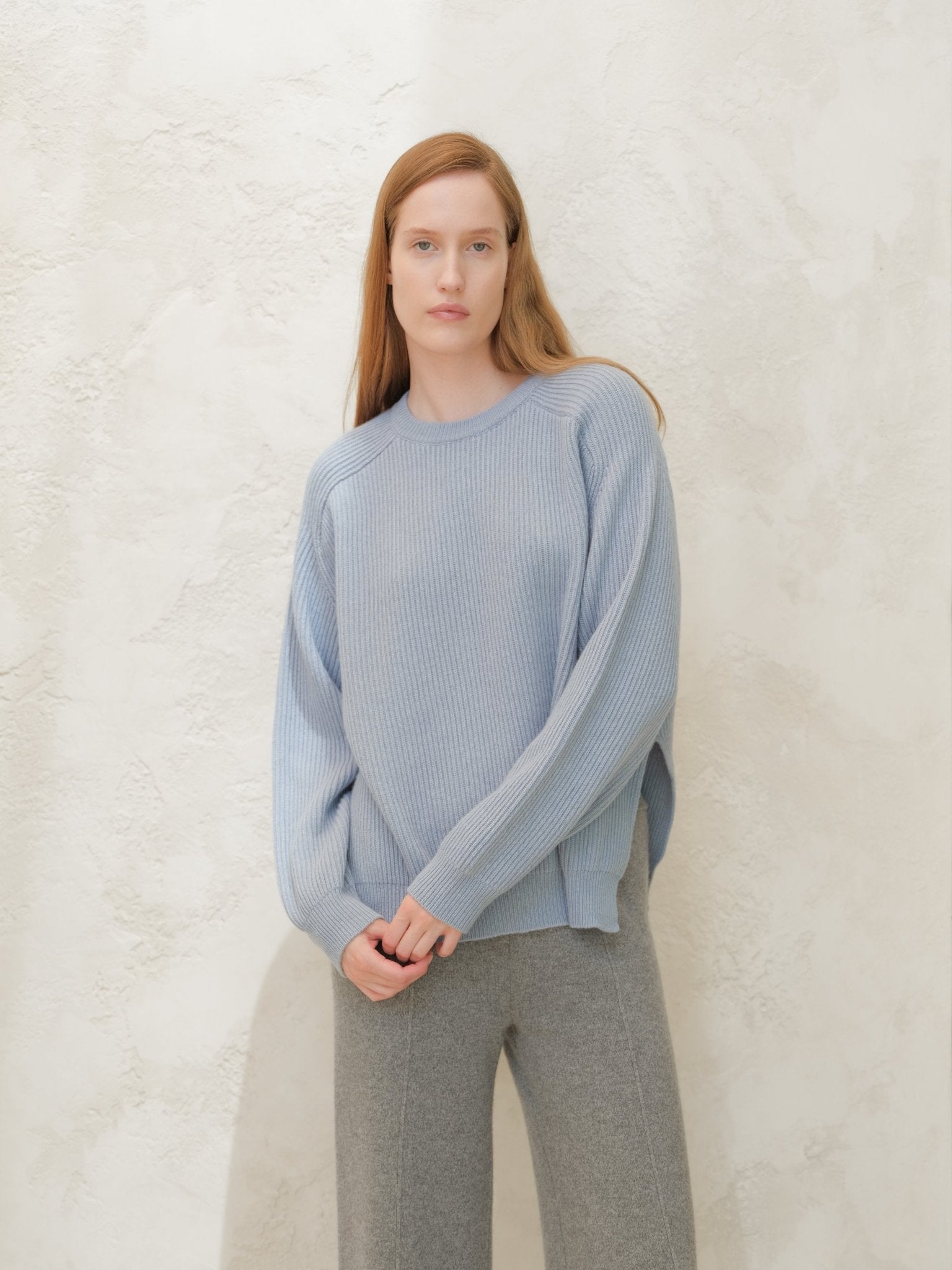 Cashmere Mix Crewneck Ribbed Sweater with Lateral Slits
